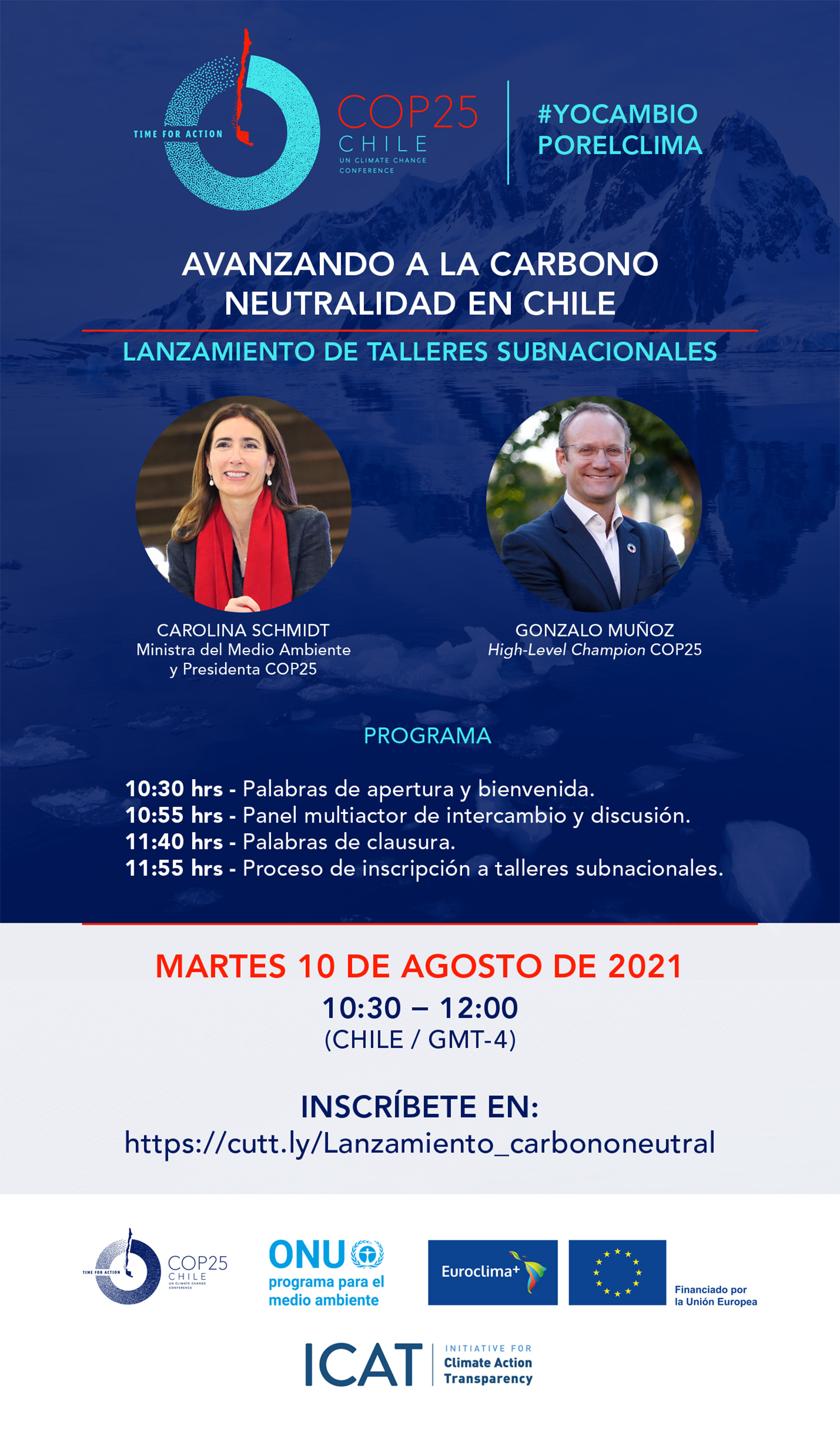 El día 10 de agosto de 2021, de 10:30 a 12:00 horas se realiza el lanzamiento de los Talleres Subnacionales “Avanzando a la Carbono Neutralidad”, que serán lugares de encuentro de los sectores público, privado y la comunidad para aprender cómo aportar a la meta de la carbono neutralidad al 2050 desde cada región de Chile.