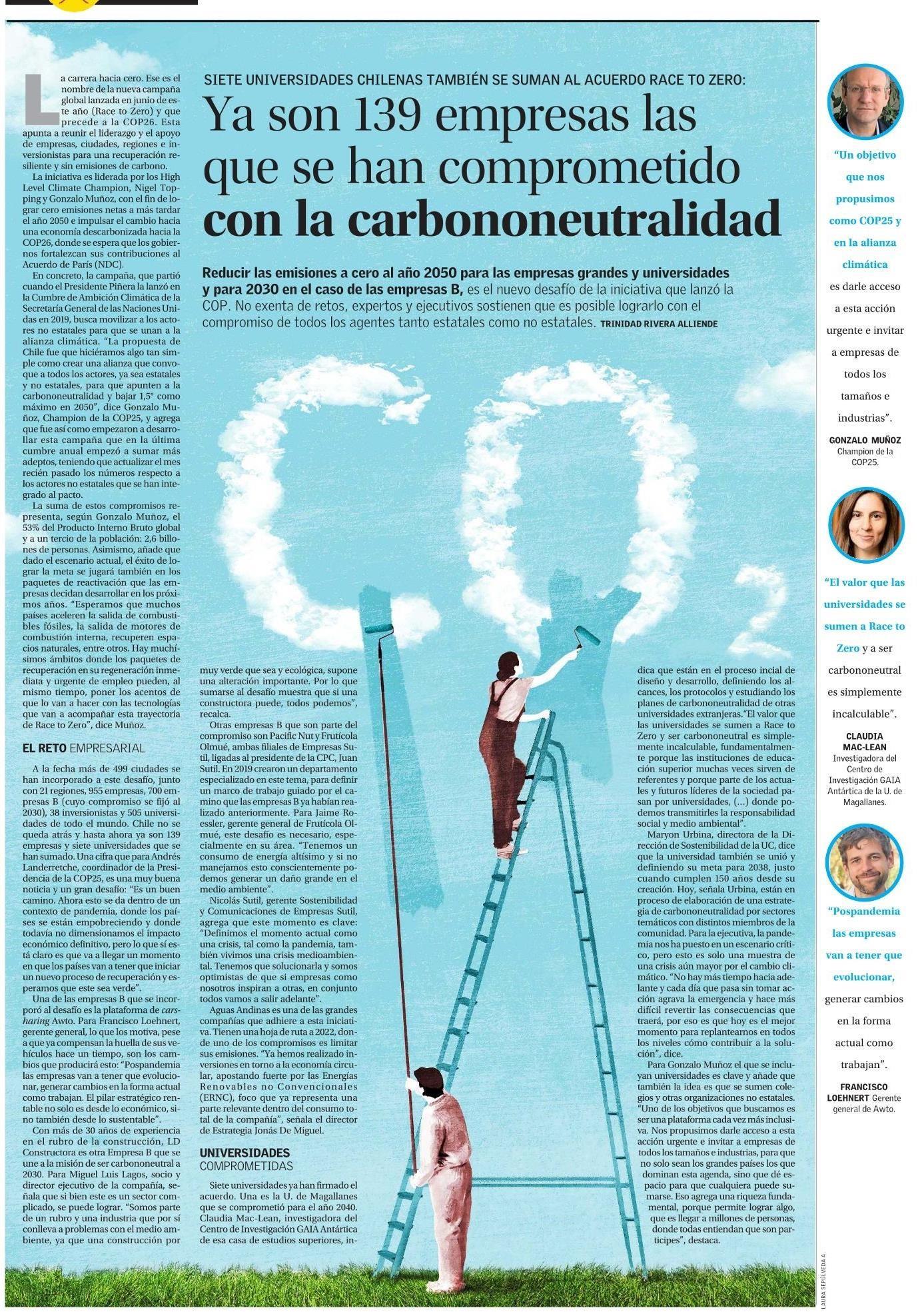 A la fecha más de 499 ciudades se han incorporado a este desafío, junto con 21 regiones, 955 empresas, 700 empresas B (cuyo compromiso se fijó al 2030), 38 inversionistas y 505 universidades de todo el mundo. Chile no se queda atrás y hasta ahora ya son 139 empresas y siete universidades que se han sumado. Una cifra que para Andrés Landerretche, coordinador de la Presidencia de la COP25, es una muy buena noticia y un gran desafío: ‘Es un buen camino. Ahora esto se da dentro de un contexto de pandemia, donde los países se están empobreciendo y donde todavía no dimensionamos el impacto económico definitivo, pero lo que sí está claro es que va a llegar un momento en que los países van a tener que iniciar un nuevo proceso de recuperación y esperamos que este sea verde’.